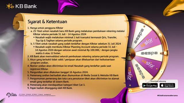 KB Bank mengadakan undian tiket konser aespa Live Tour 2024 bagi para nasabah eksisting maupun calon nasabah. Program lucky draw ini bisa diperoleh dengan membuka rekening melalui aplikasi digital banking KBstar. 30 nasabah yang beruntung akan mendapatkan tiket konser aespa Live Tour 2024 untuk kategori CAT 3.